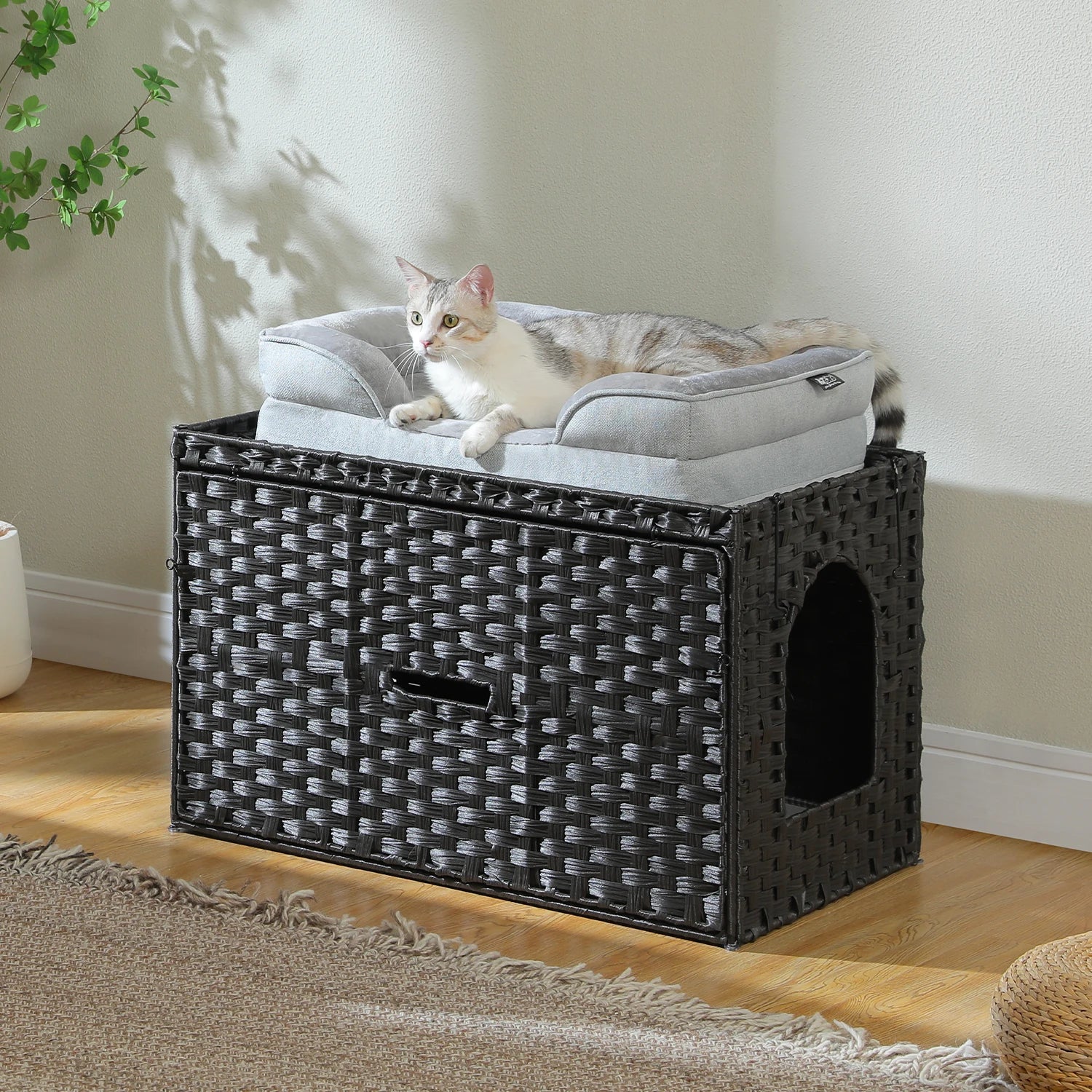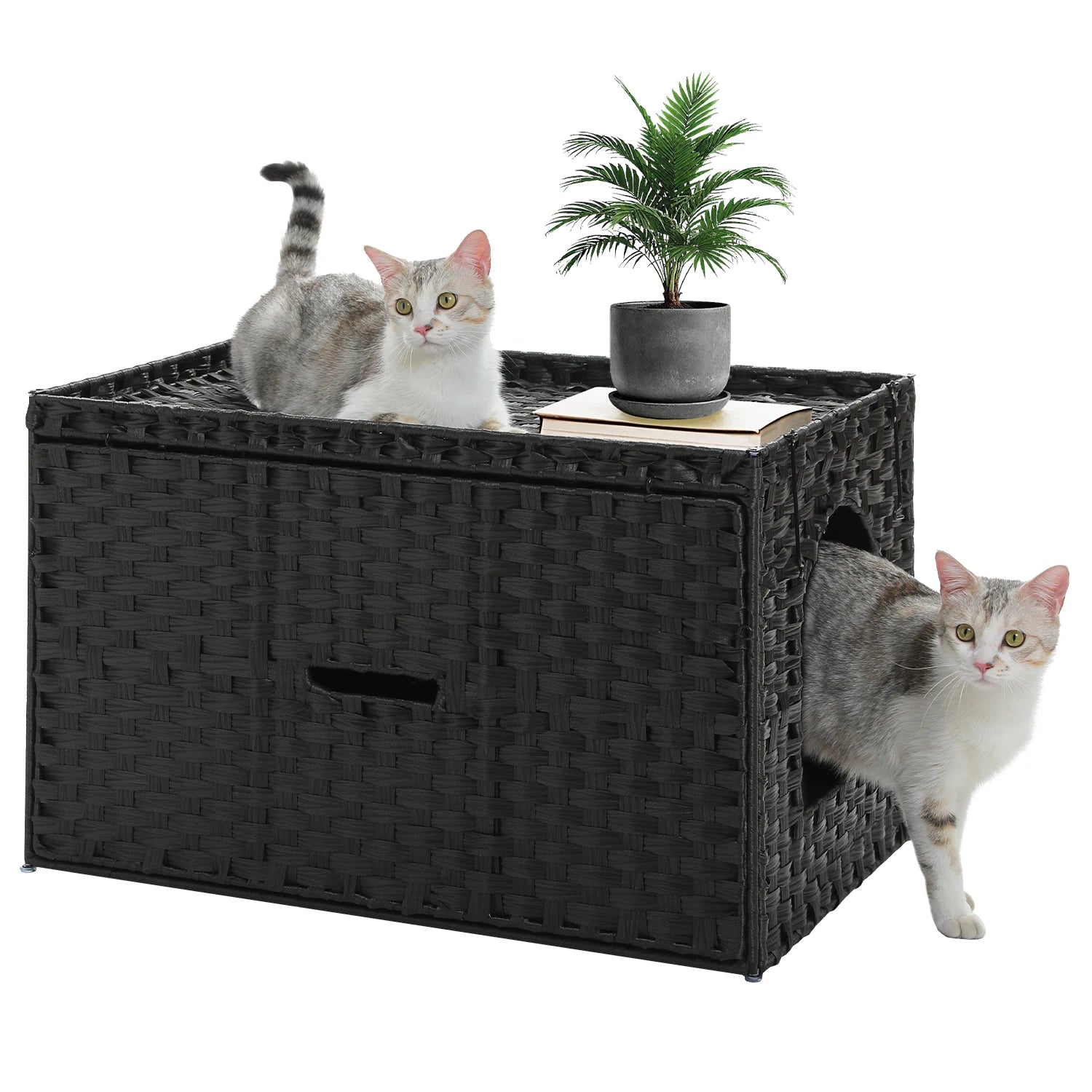 Cat Litter Box Enclosure Furniture with Door Hidden Litter Box Handwoven Rattan Cat House Bed for Large Cats Indoor Living Room